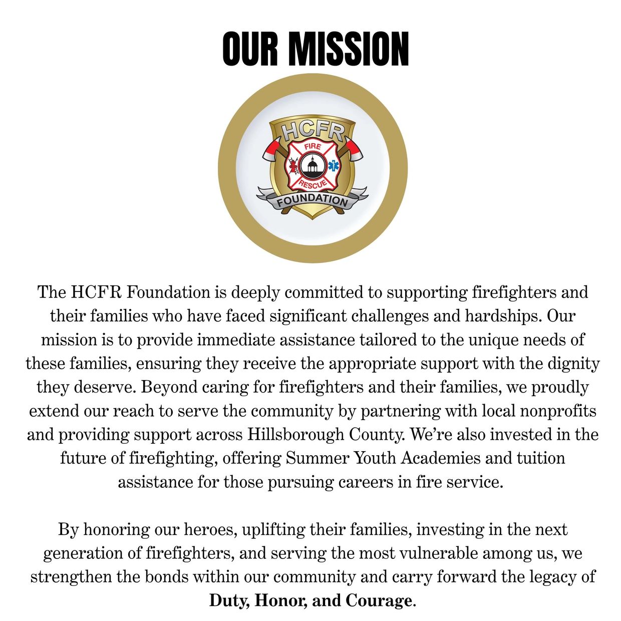 Providing direct financial and logistical support to firefighter families facing unexpected hardships, emergencies, or loss, ensuring those who dedicate their lives to protecting our community receive care, stability, and support when they need it most.